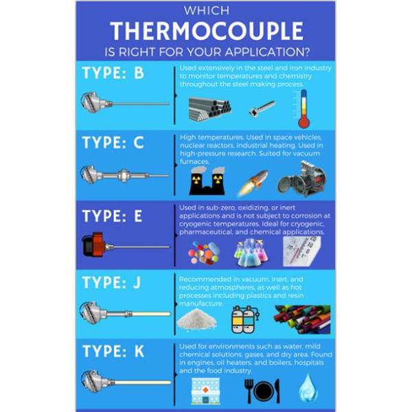 3) GME company providing thermocouples are manufactured in different combinations of metals. The calibrations are K, N, E.J, T, S, R, B. Each calibration has a different temperature range.